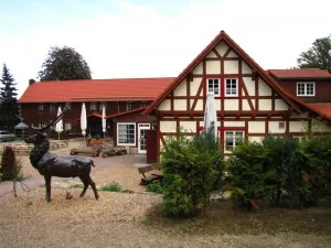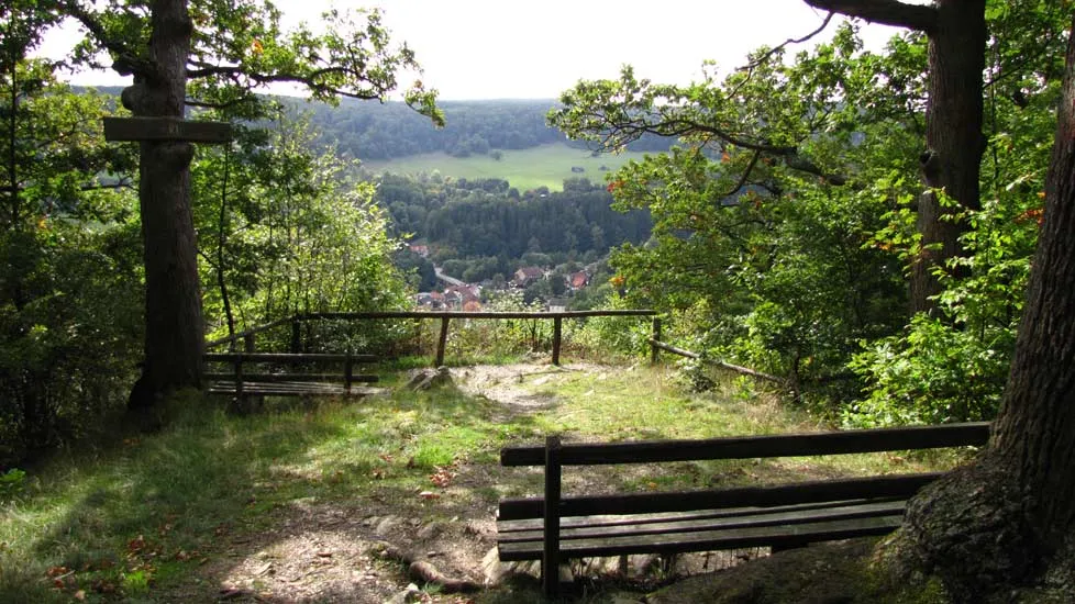 The rest area under the tall oak trees is very idyl­lic and offers a beau­tiful view of Alten­brak and the Bode Valley.