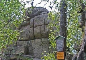 Besonders deutlich wird an den Felsen die für dieses Gebiet typische starke vertikale und horizontale Gliederung, die sogenannte Wollsackstruktur.